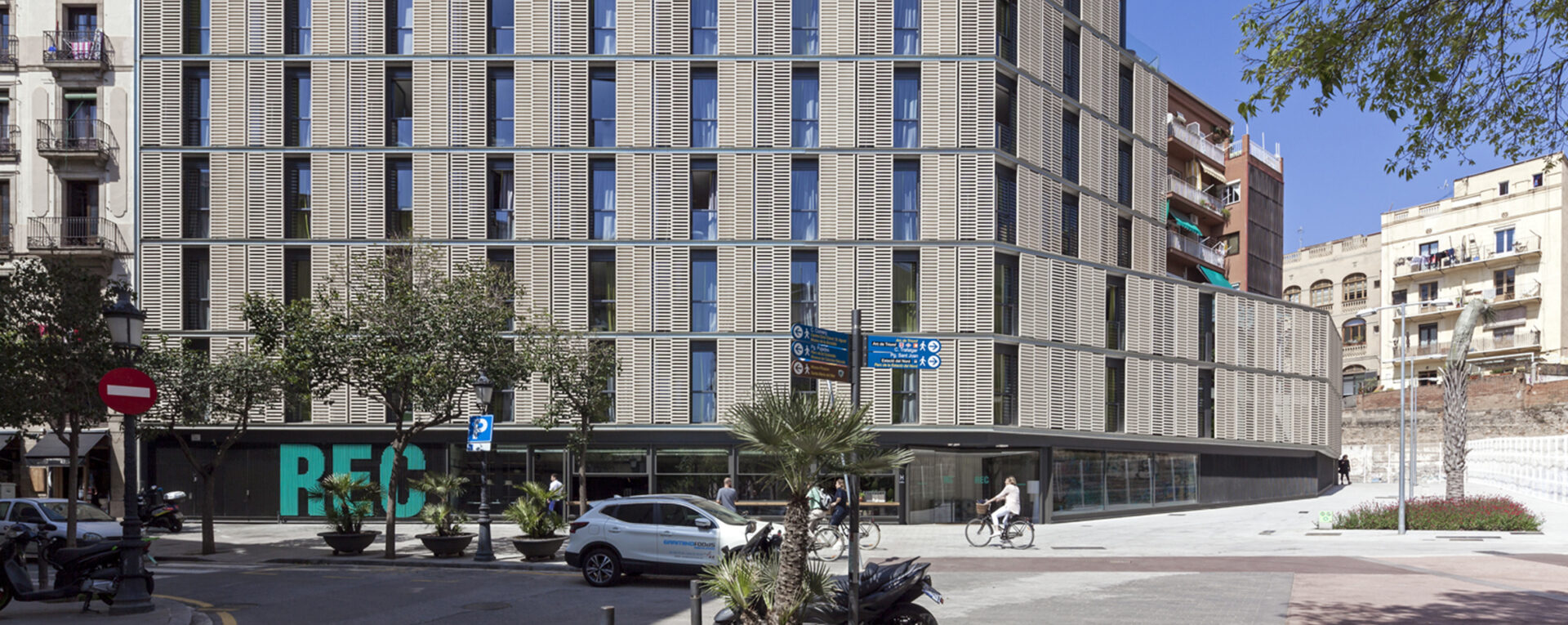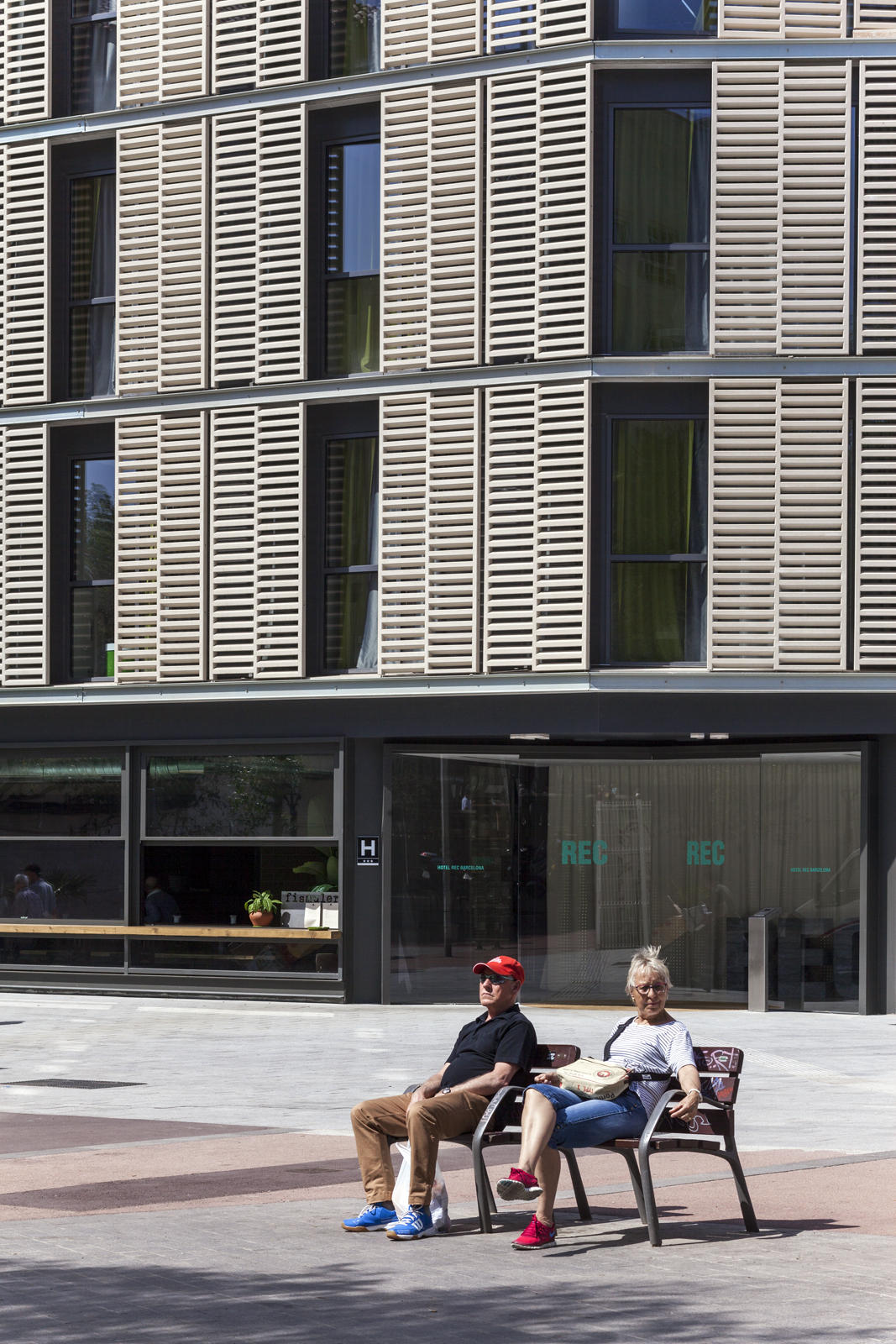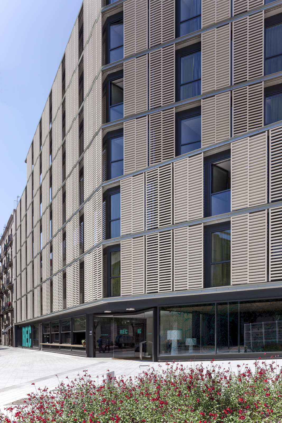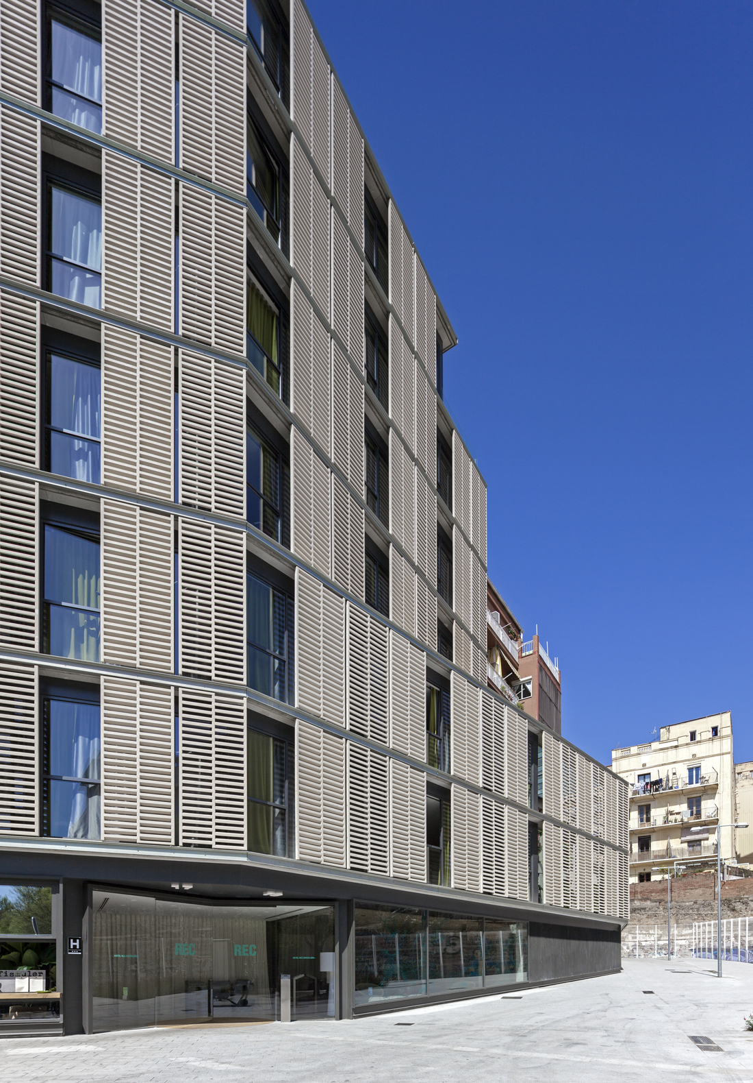 The building blends into the neighbourhood, searching for a balance between a contemporary image and respect for its historical surroundings and reconciling this apparent contradiction between the materials used in the UHPC-Slim concrete latticework that characterises the hotel facade and the faceted volumetric composition that folds in on itself and opens up directly onto the Lluís Companys Promenade.