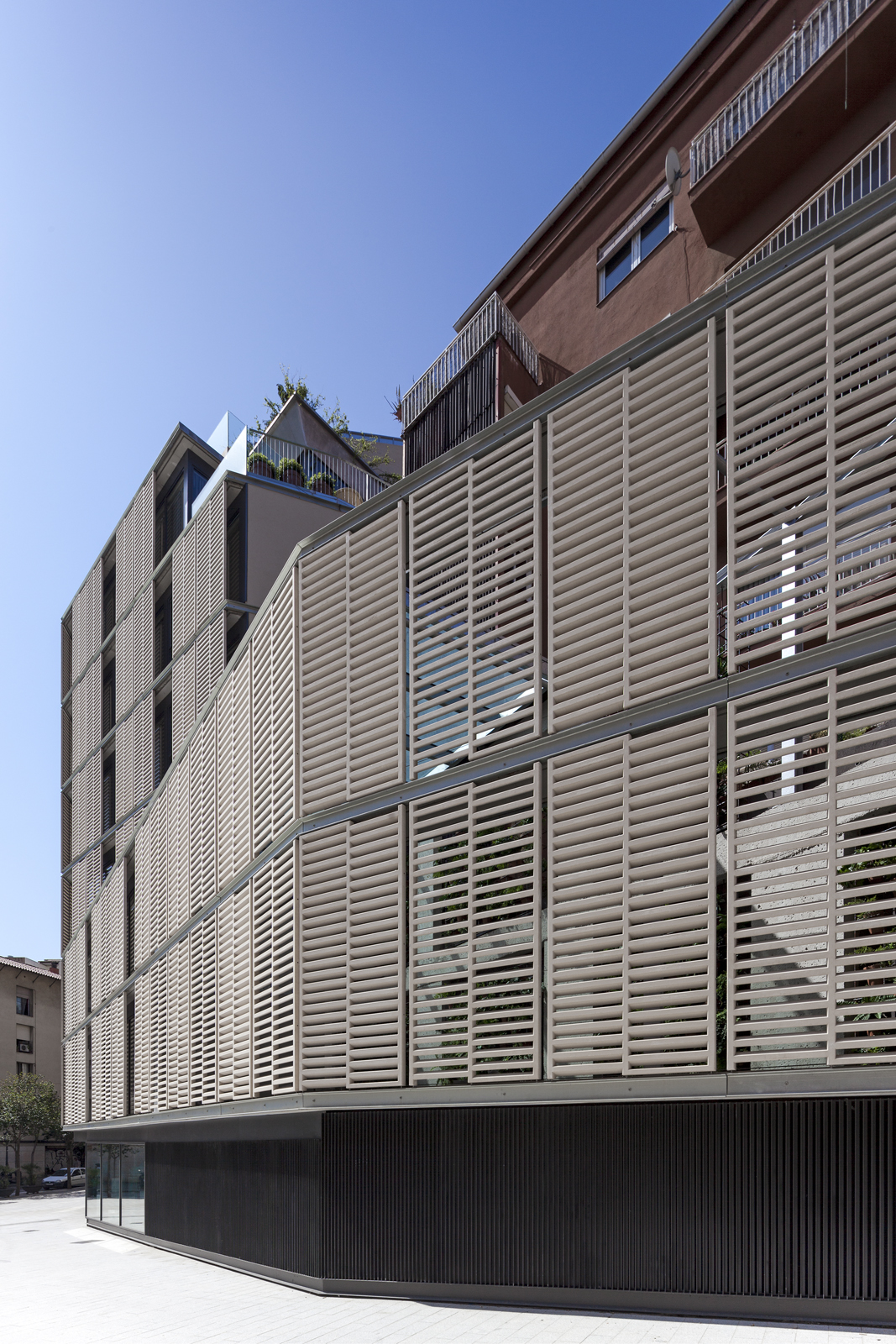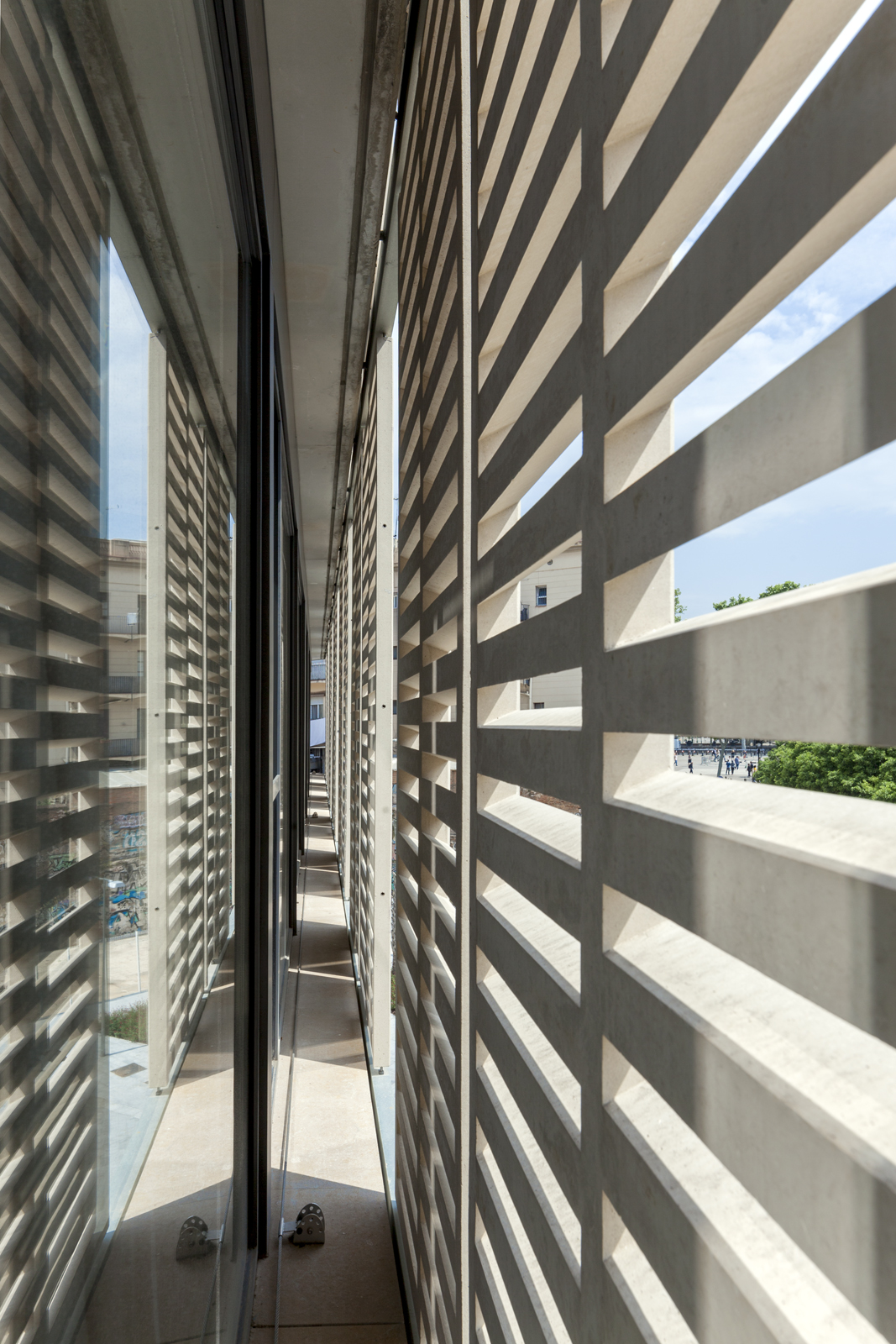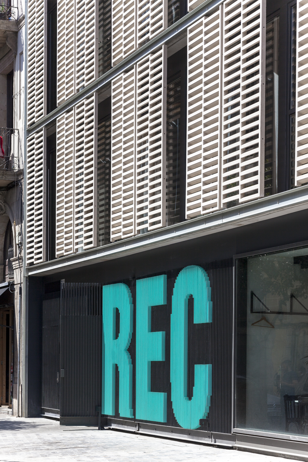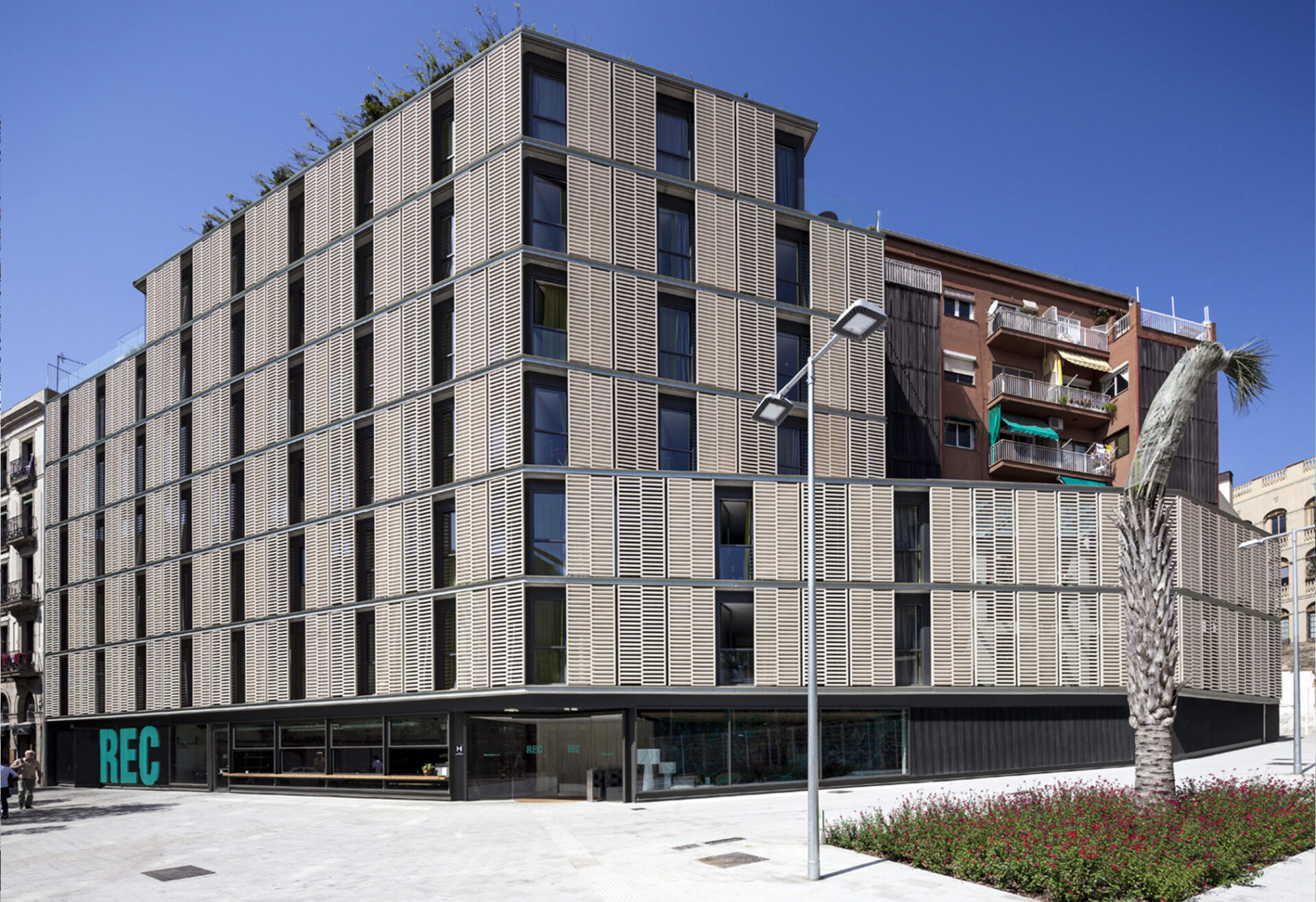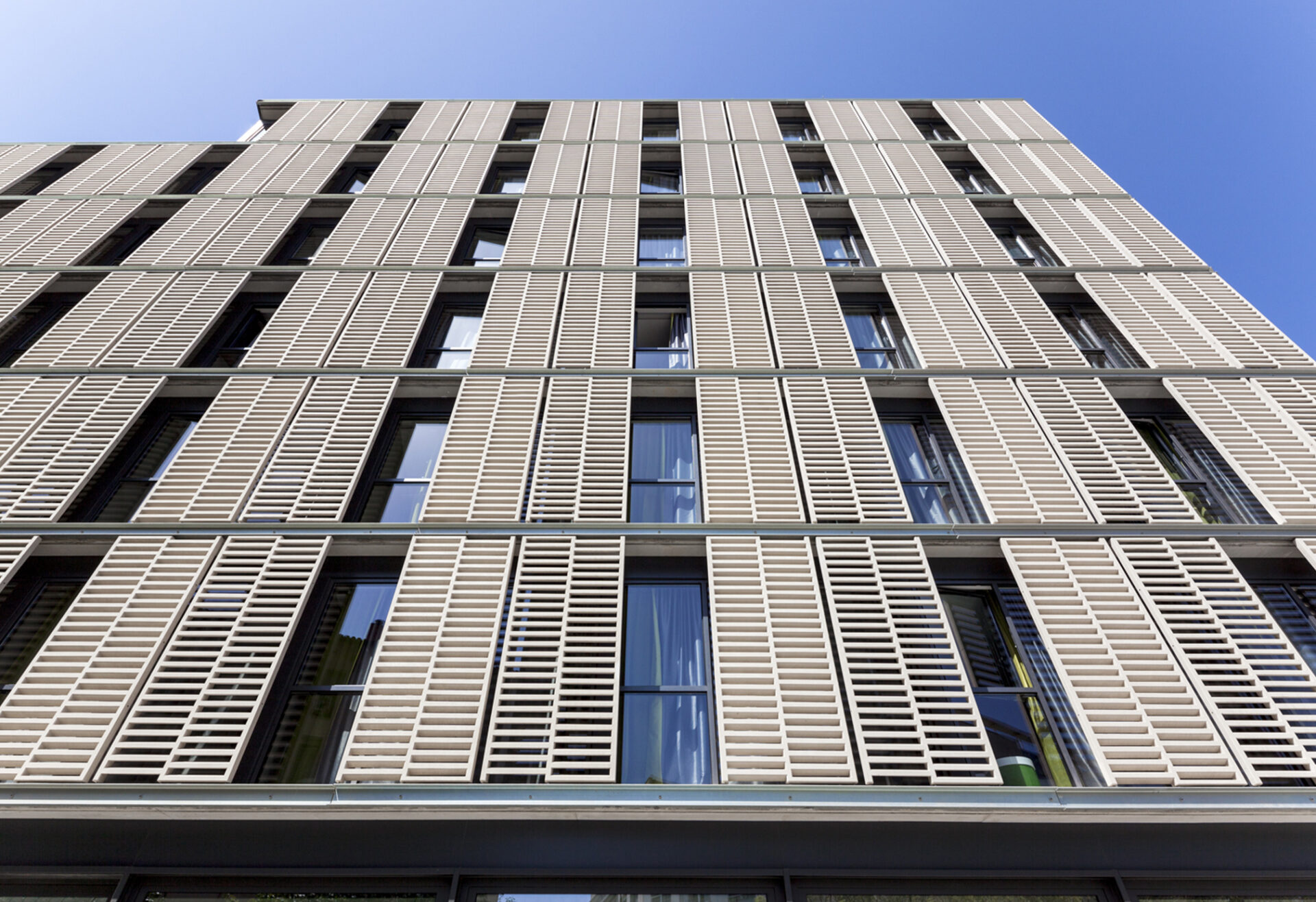 The building blends into the neighbourhood, searching for a balance between a contemporary image and respect for its historical surroundings and reconciling this apparent contradiction between the materials used in the UHPC-Slim concrete latticework that characterises the hotel facade and the faceted volumetric composition that folds in on itself and opens up directly onto the Lluís Companys Promenade.