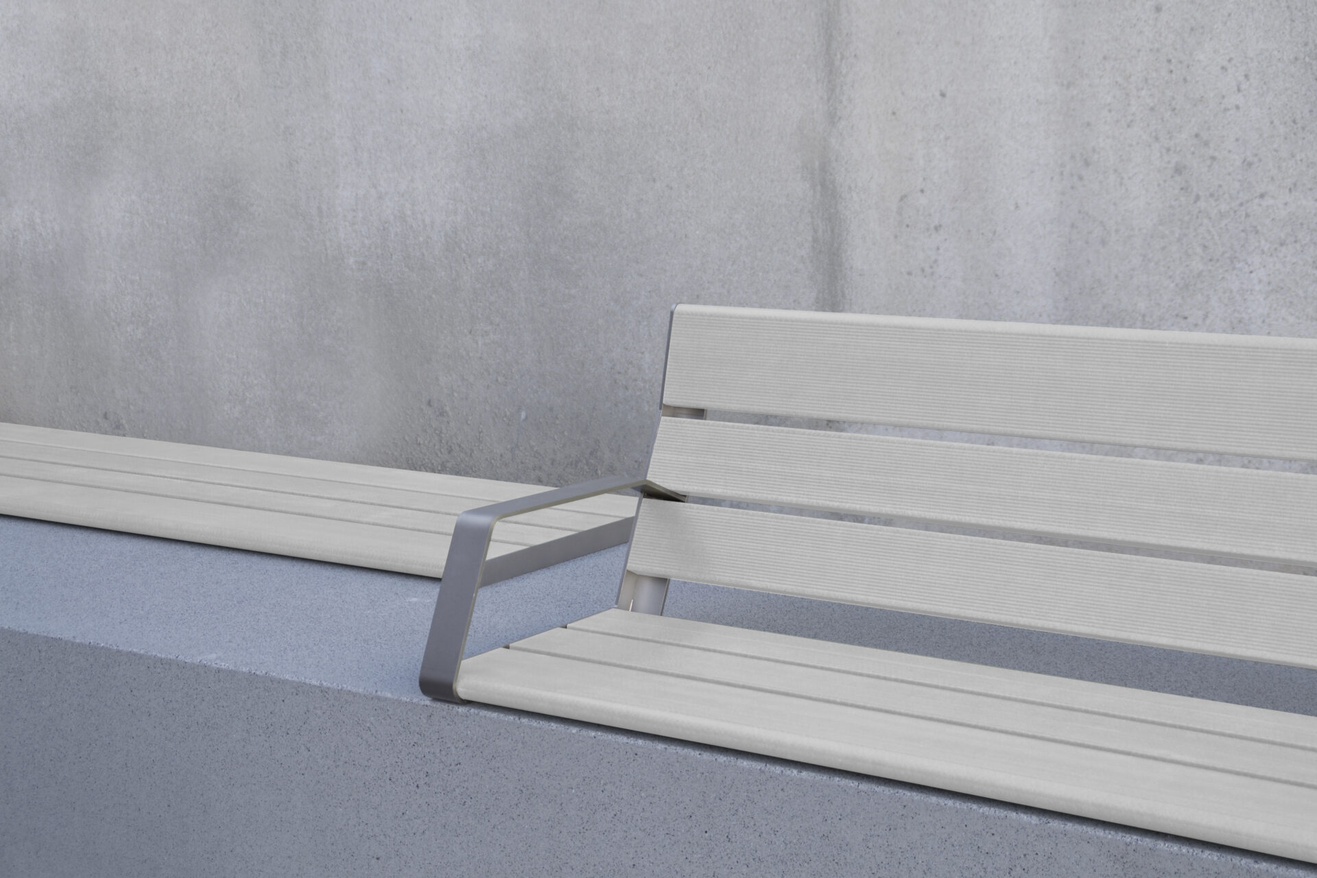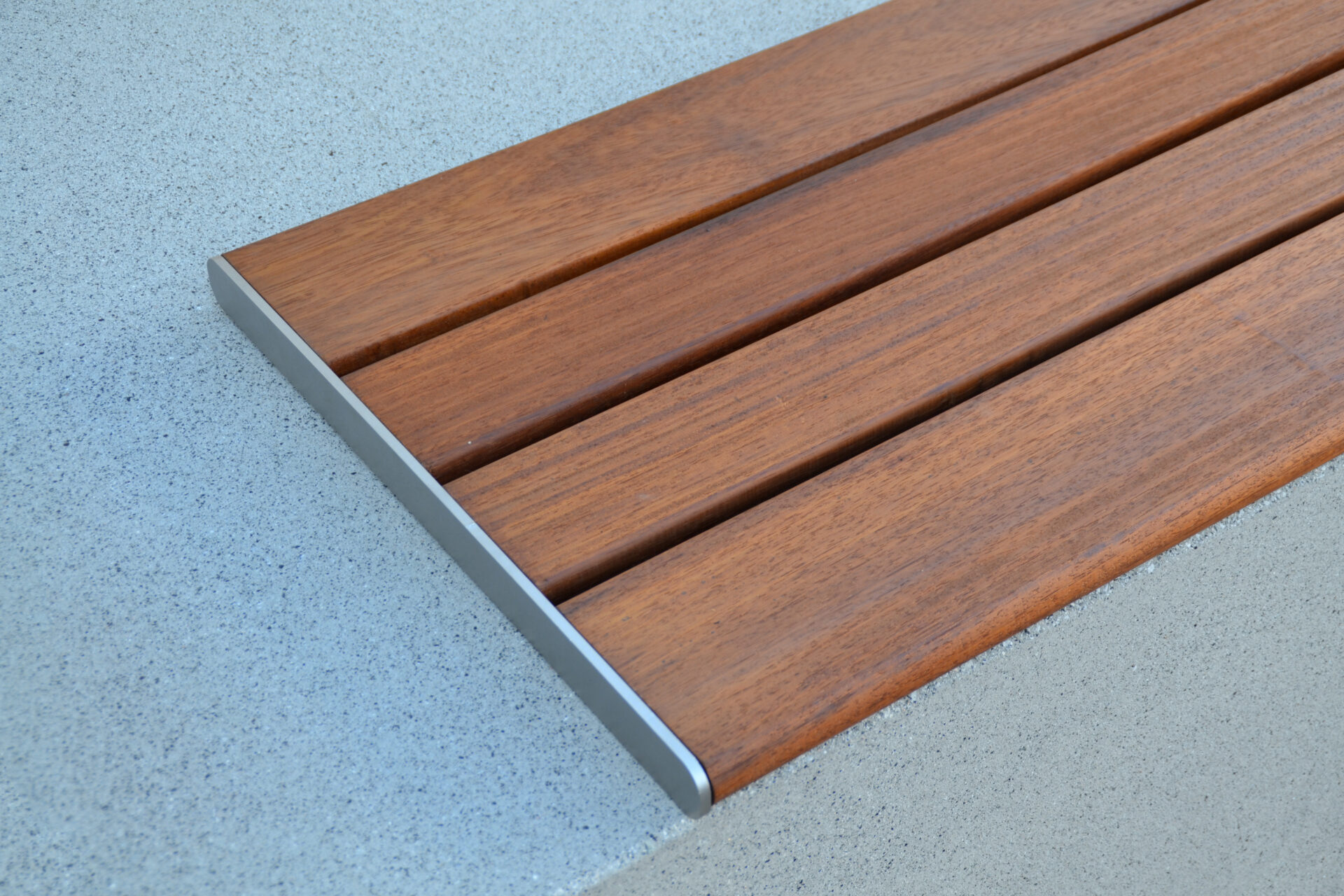La estructura de los soportes es de pletina de acero mecanizado de 6 mm de grueso zincada y pintada color plata o de acero inoxidable pulido. Los asientos de listones de madera tropical certificada FSC® o PRFV color RAL 7047 se presentan con o sin respaldo y en dos longitudes: 60 cm y 180 cm. Anclado sobre muro o sobre bancada de forma oculta y permanente con tornillería de acero inoxidable y tacos metálicos expansivos.