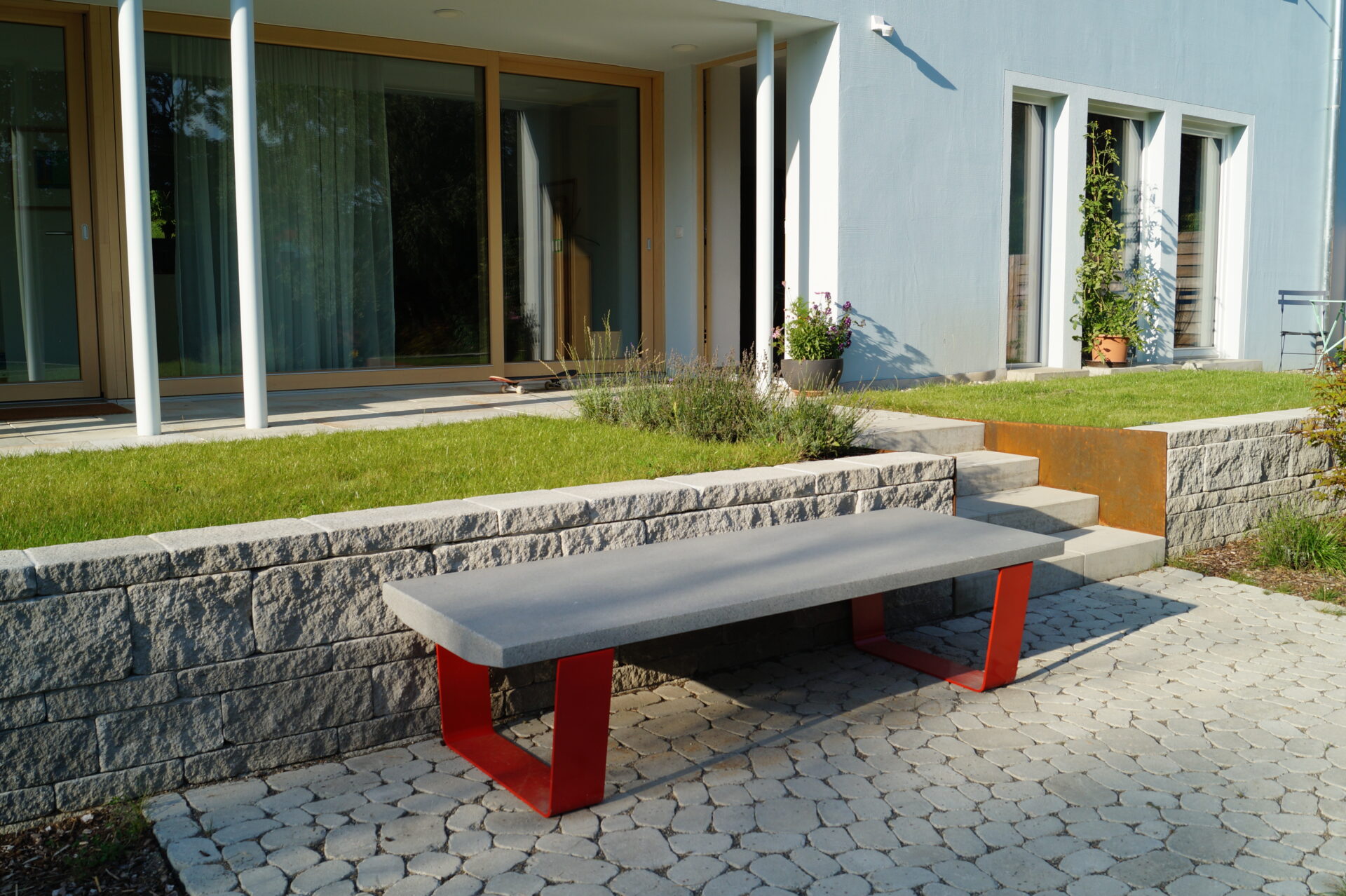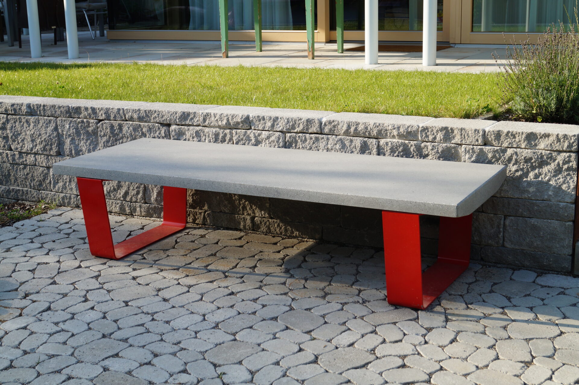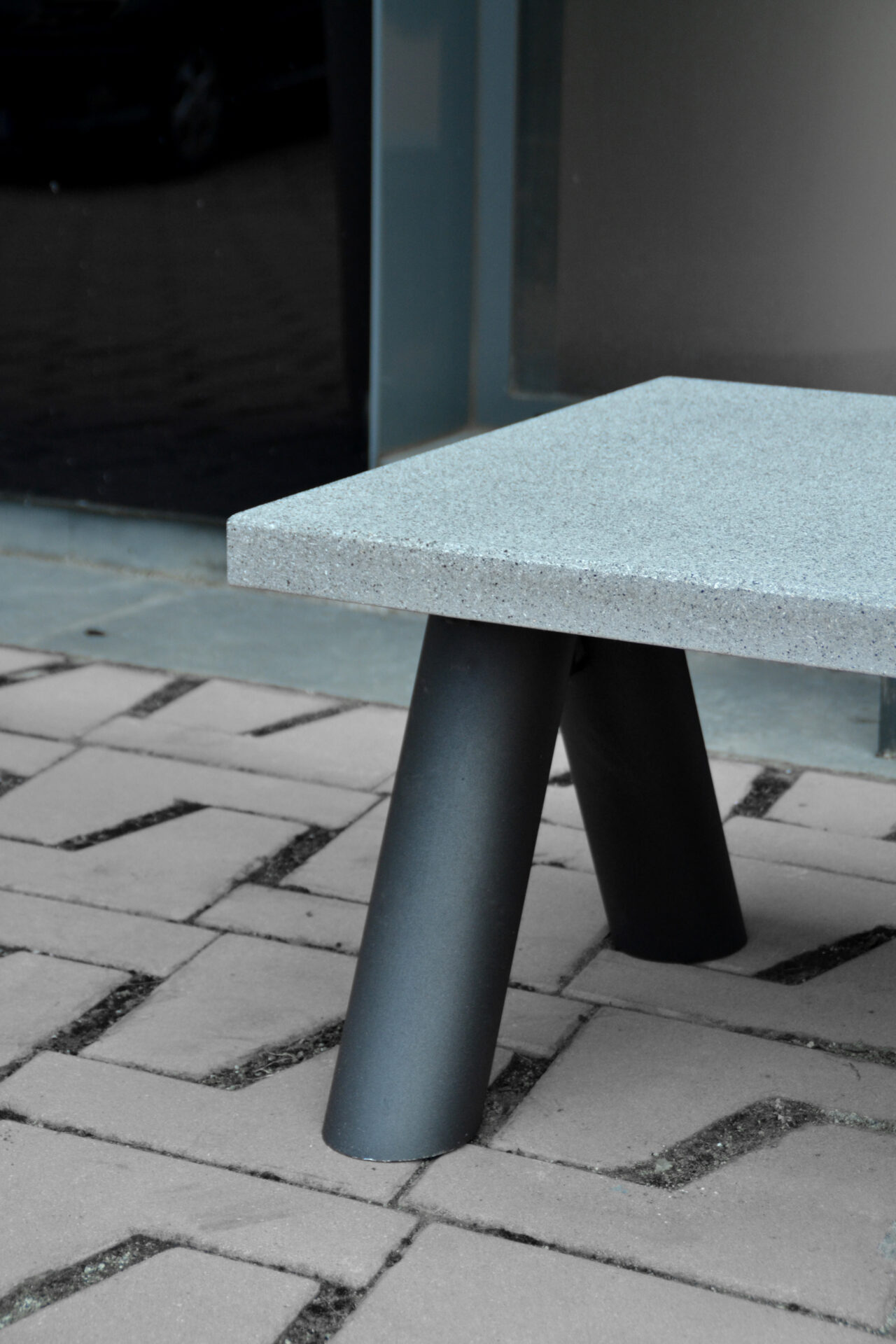 La losa de asiento está fabricada en hormigón UHPC-Slimconcrete, acabado decapado e hidrofugado o pulido suave, color según carta estándar de Escofet. Los soportes son de acero zincado y pintados en gris texturado, negro efecto forja o rojo RAL 3020. Stone se entrega con instrucciones de montaje “in situ” de sus componentes. De fácil manipulación, los soportes se fijan a la bancada con tornillería de acero inoxidable en casquillos embebidos en la losa de la bancada.