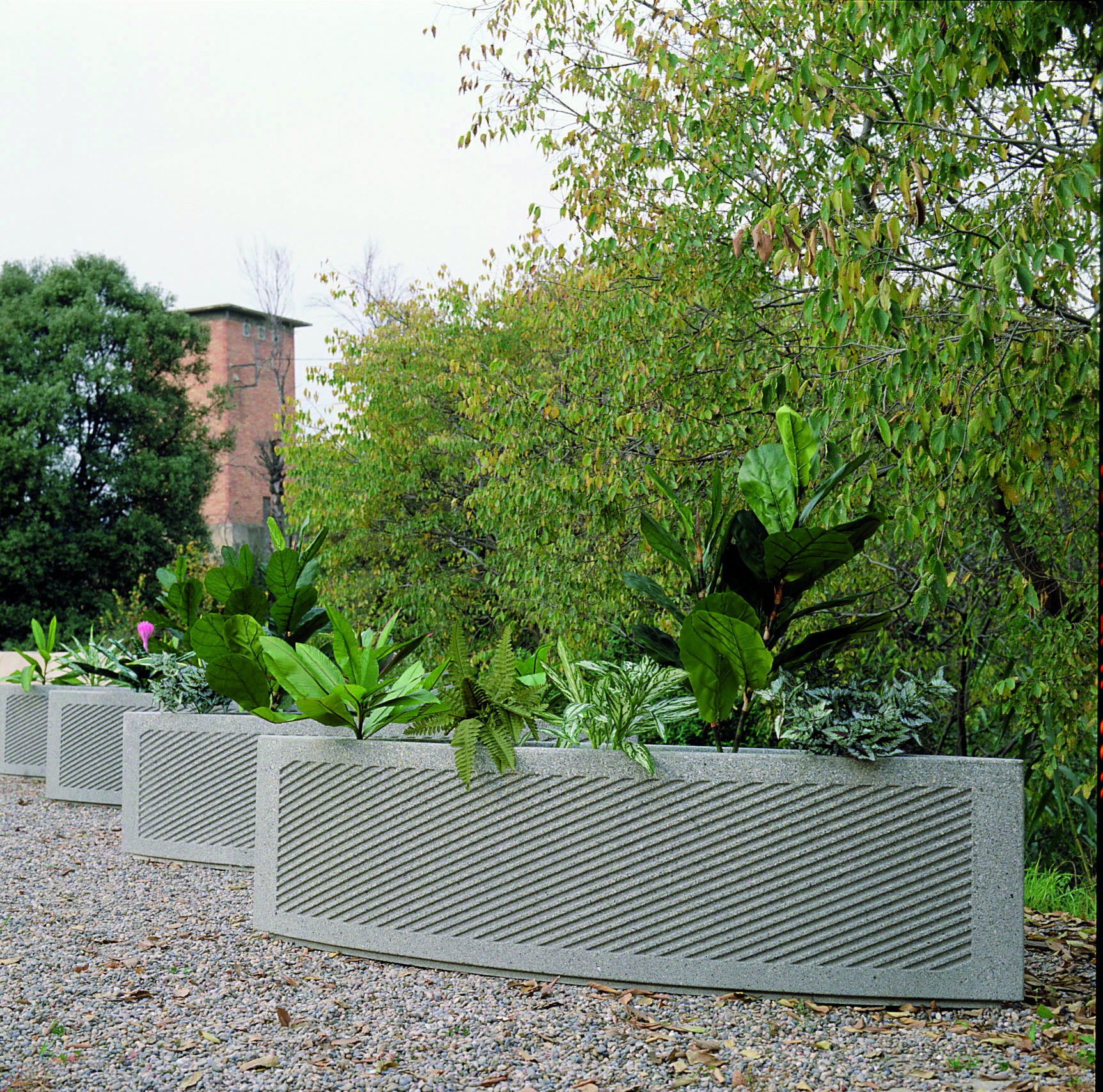 Resalta por su forma oval y afilada en sus extremos que aligera su presencia. La textura incorpora unas hendiduras lineales e inclinadas que reducen el peso aparente del hormigón, a la vez que sirven de transición hacia la verticalidad de las plantas que crecen en su interior. La alineación de varias jardineras actúa como límite vegetal entre calzada y vial pudiendo prescindir de pilonas o bolardos.