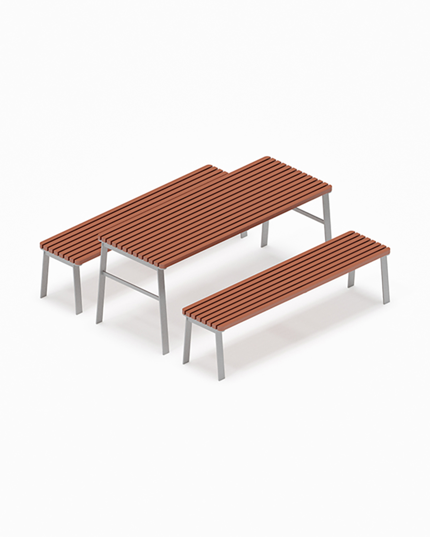 La estructura de los soportes de pletina de acero mecanizada, cincada y pintada color plata acabado texturizado. También disponible en acero inoxidable. Los asientos de listones de madera tropical certificada FSC®, se presentan con o sin respaldo y en dos longitudes.