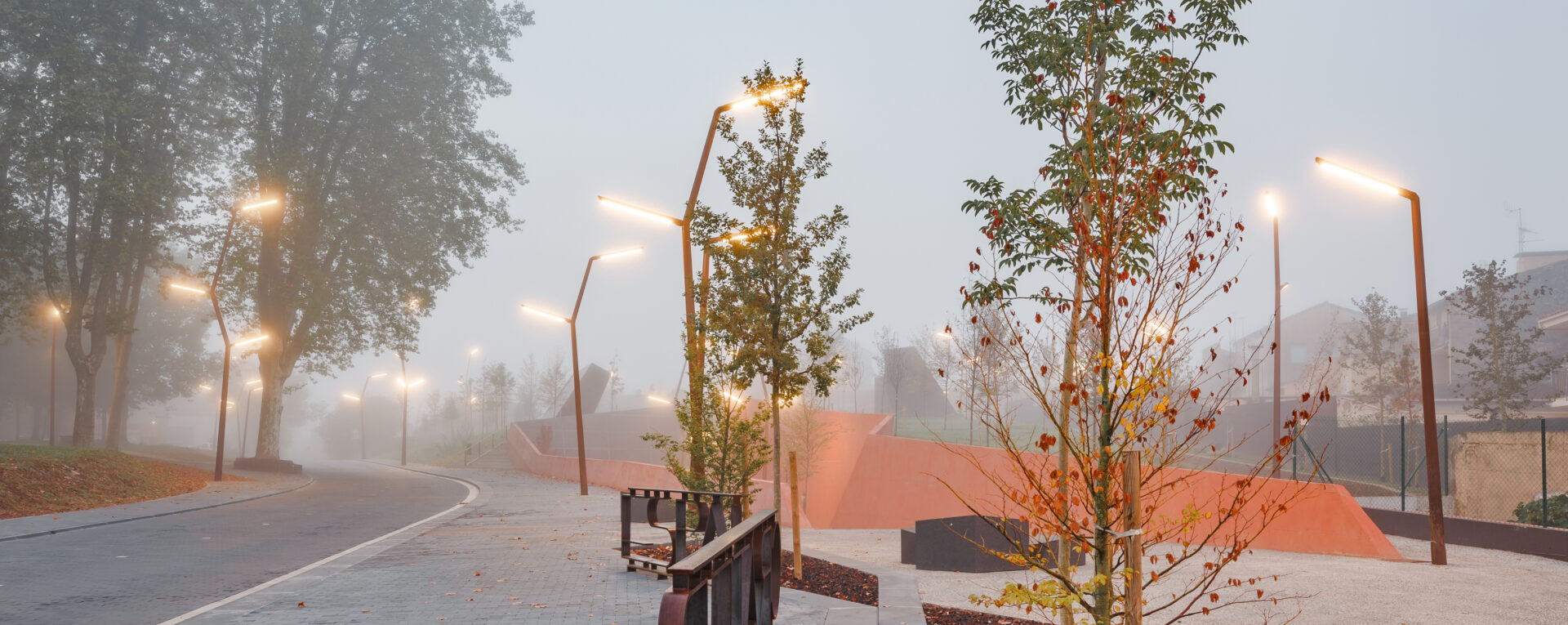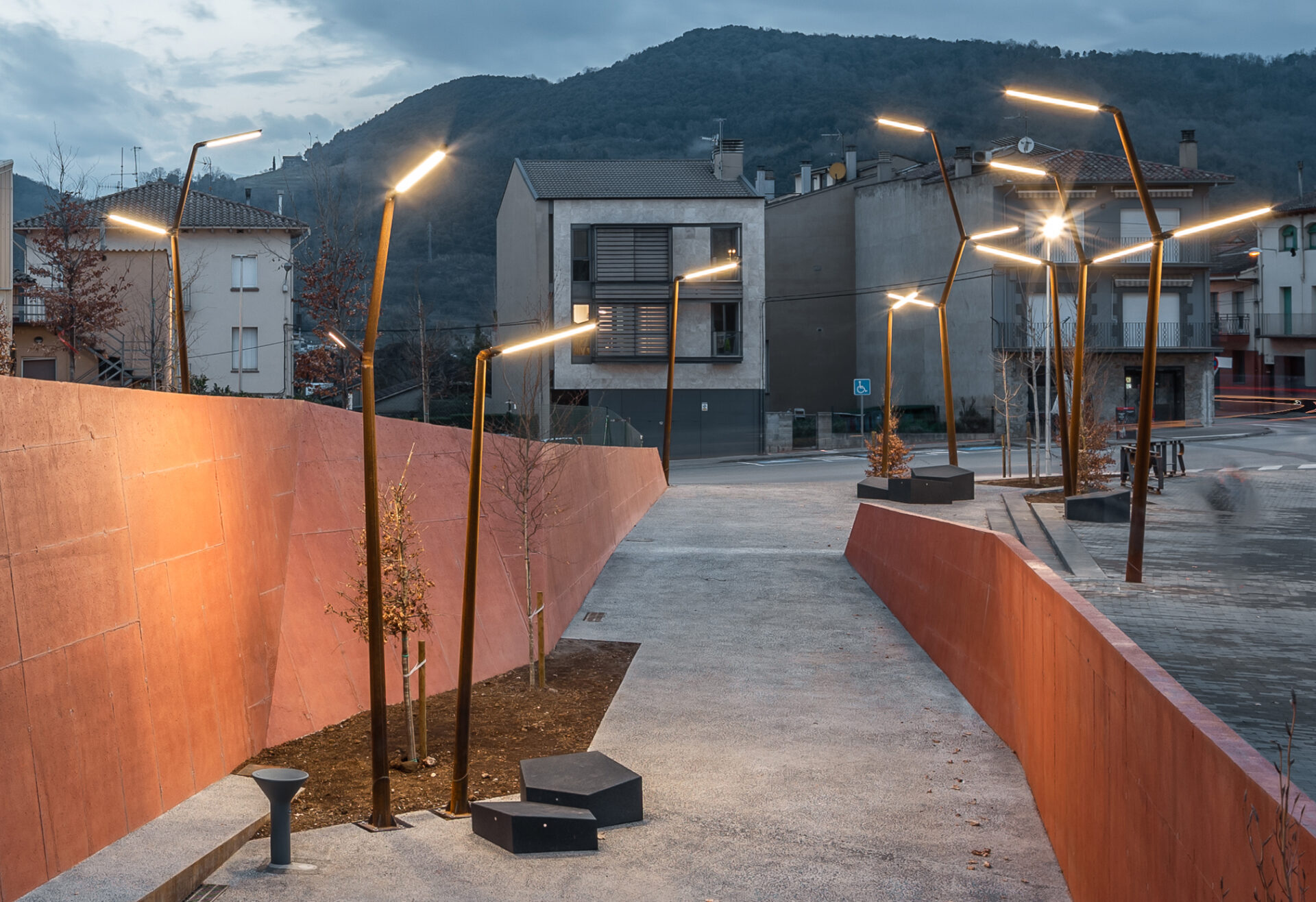El entorno urbano está concebido como un hayedo natural. El mobiliario y las luminarias urbanas forman parte del diseño del parque. Sobre la cubierta, crece un nuevo hayedo iluminado con hasta tres modelos de columnas arborescentes que se confunden con los mismos árboles, la iluminación LED consigue un buen efecto de distribución y uniformidad lumínica de temperatura de color 3000K, las columnas y el cuerpo lumínico están fabricadas en acero corten. Los bancos se mimetizan con las características geometrías de las columnas basálticas, formaciones pentagonales en diferentes alturas que se generan con el enfriamiento de la lava.