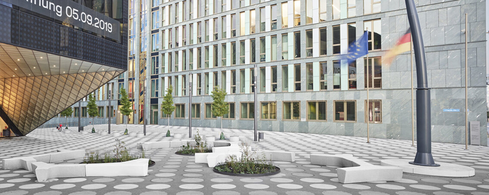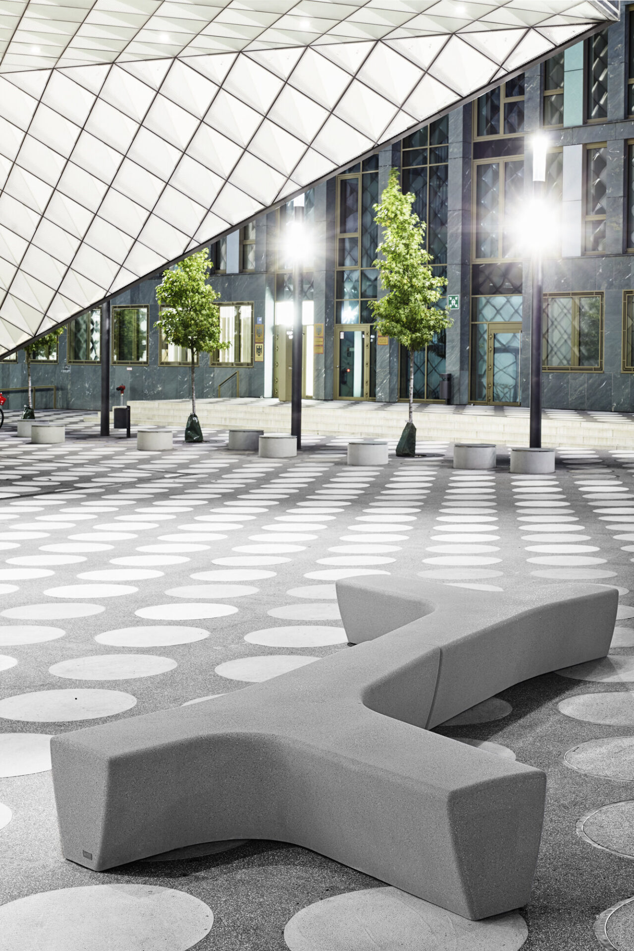 Las opciones de asiento, el camino y las áreas de descanso están dispuestas de forma lúdica dentro del patrón. La banca modular Twig de hormigón se combina con su versión Air de polietileno de alta densidad blanco que se retroilumina por la noche. La vegetación se coloca siguiendo el patrón del suelo y los árboles se sitúan dentro del alcorque metálico Carmel.