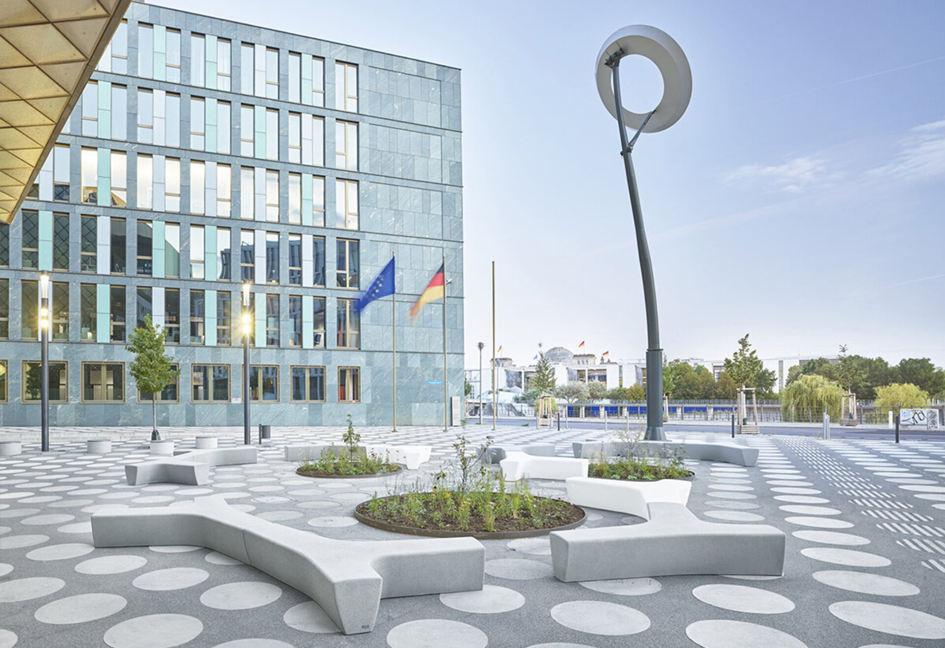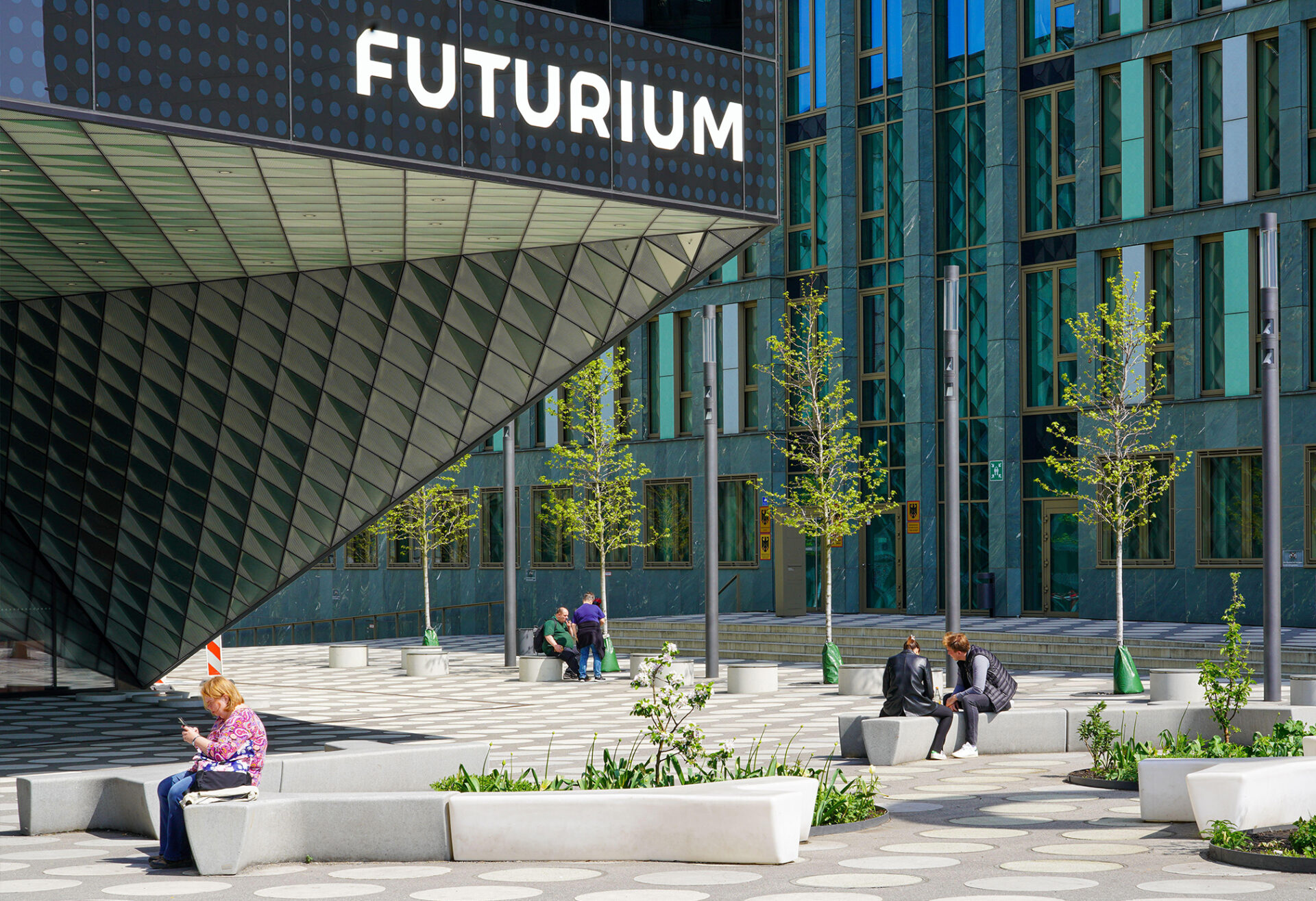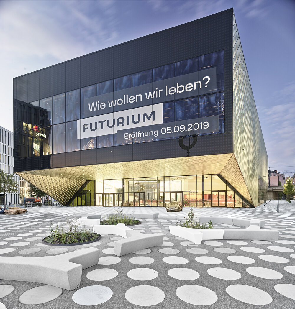 El edificio Futurium afirma su identidad escultural en su contexto urbano. El volumen construido se retranquea para generar nuevos espacios públicos. También se pliega hacia arriba para crear puntos urbanos elevados. Para unificar los espacios exteriores, toda la superficie del suelo está revestida de asfalto sin fisuras, y articulada con un patrón de puntos que dan carácter al proyecto.
