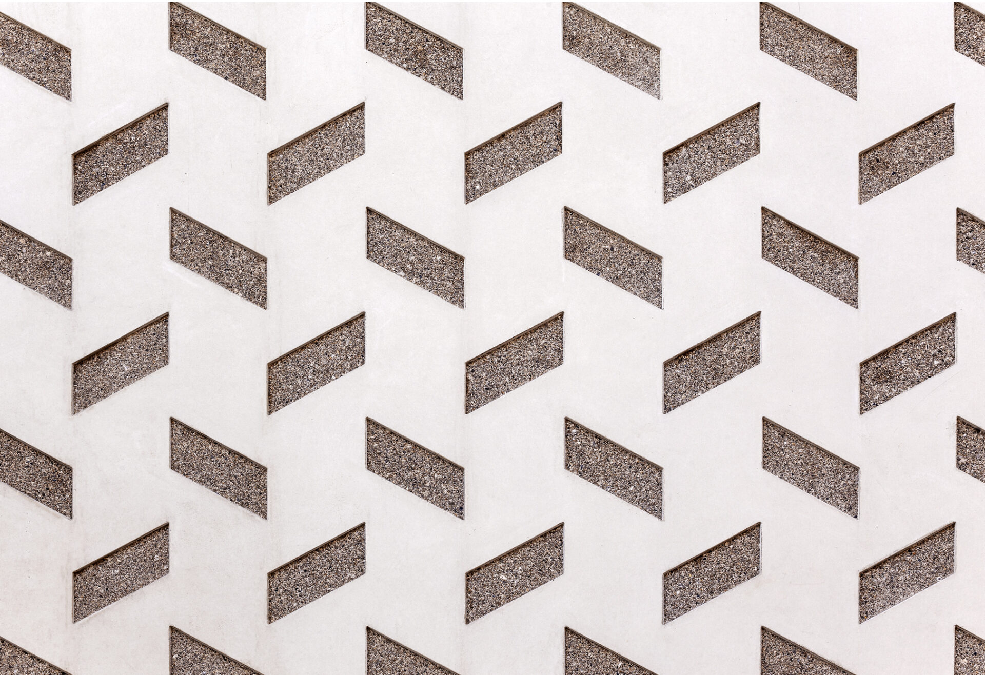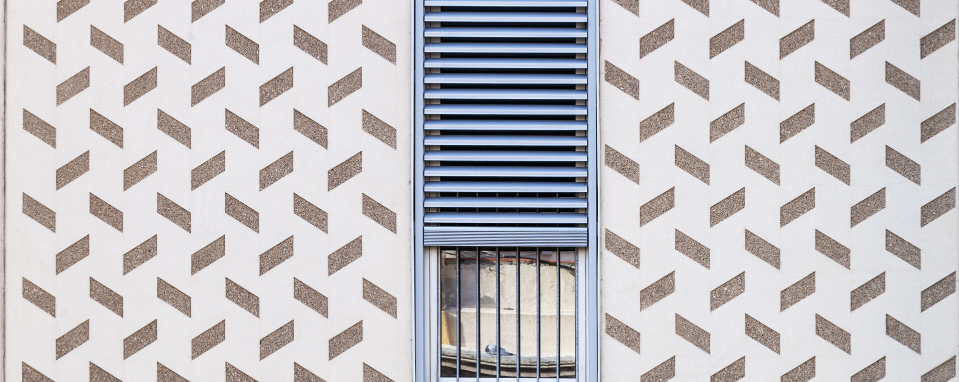 La arquitectura de los nuevos volúmenes trata de evocar la memoria de la ciudad y completar de algún modo, su frente edificado. Tomamos como referencia los elementos atemporales que conforman la personalidad del barrio; Tribunas, Balcones, Contraventanas, paramentos Esgrafiados, etc. formando una composición binaria, plana y sin apenas sobresaltos. La envolvente se construye mediante paneles fabricados de hormigón decapado, presentando un patrón geométrico de textura y color. Un repertorio básico de componentes ensamblados conformando un recubrimiento continuo entorno a una estructura inhercial, como una actualización, formal y constructiva, de la construcción tradicional.
