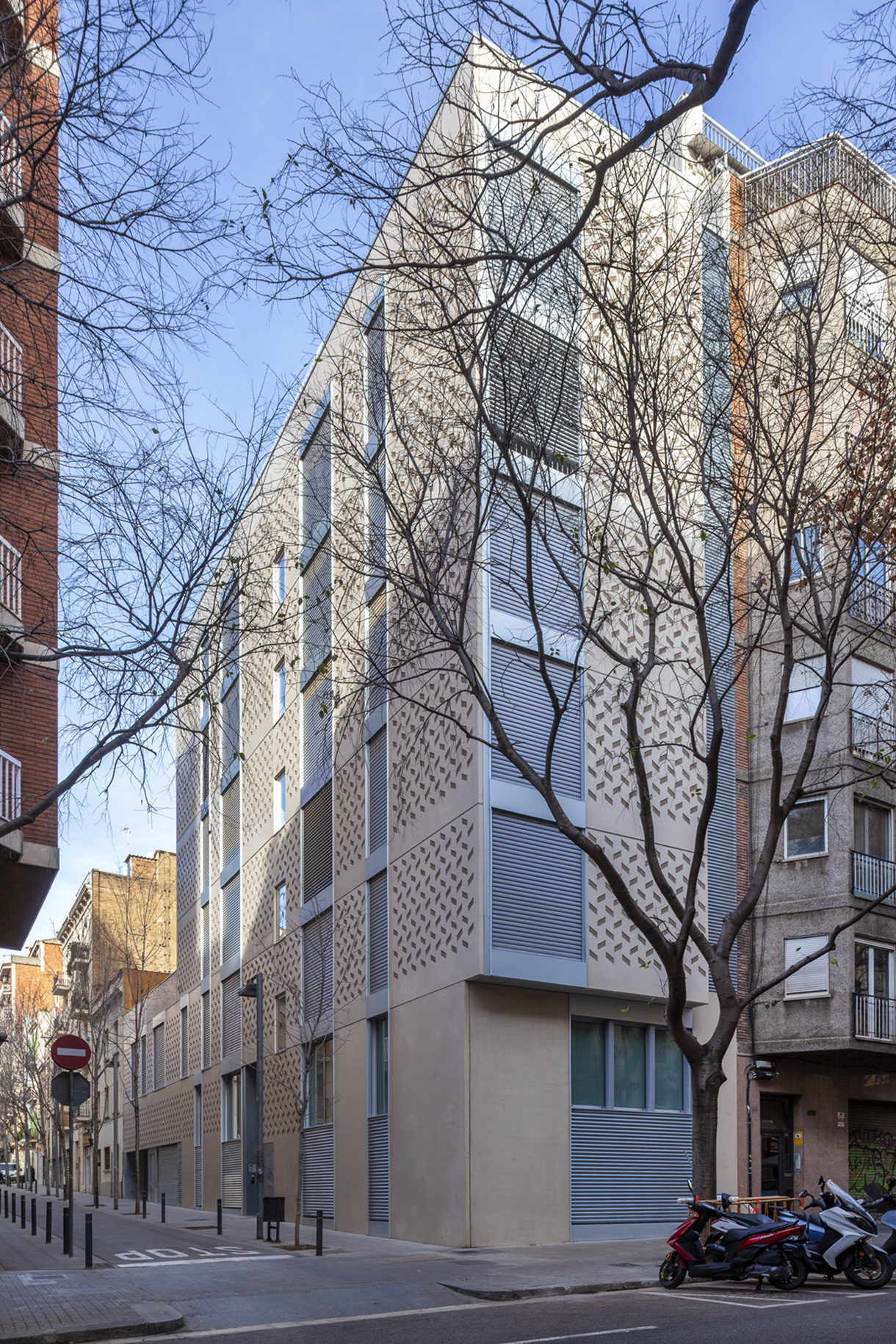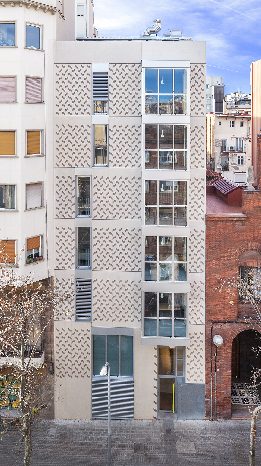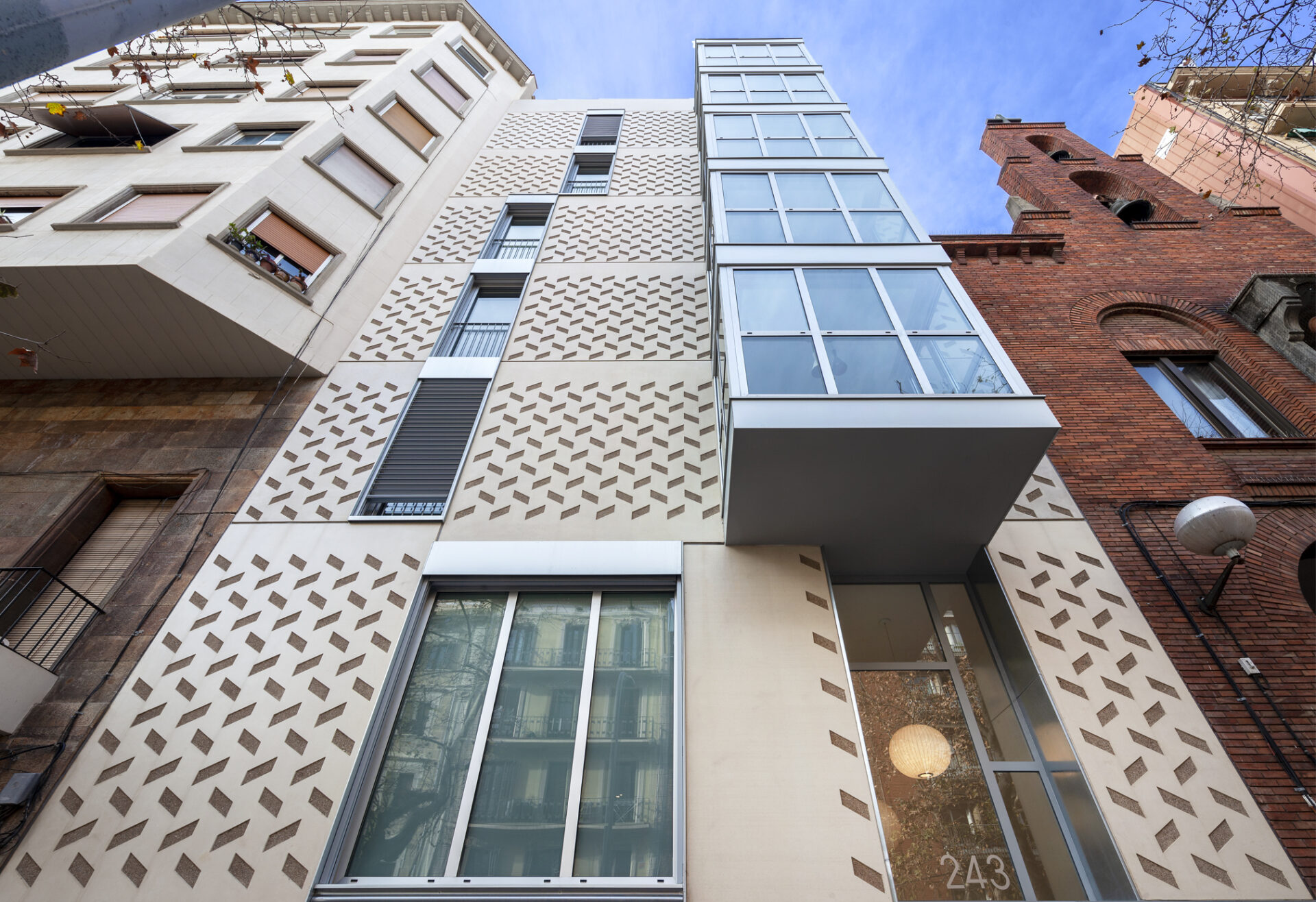 El proyecto se compone de dos edificios para uso residencial en alquiler, formando un mismo conjunto dentro del barrio del Ensanche de Barcelona. El parcelario tradicional del barrio divide el frente edificado y tiene una gran profundidad, dando como resultado cierta variabilidad de las fachadas, pero con un patio interior de manzana muy fragmentado y residual.